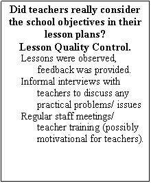 Once the objectives had been reformulated, lessons were planned, within the school’s objectives’ framework, basing them on the Accent course materials. These lessons were quality controlled for three reasons: (1) it was necessary to assess whether teachers were doing what they said they had been doing. Lessons were observed (using British-Council observation sheets) and compared to daily and weekly lesson plans. There were also informal ‘drop-in’ observations; (2) teachers were interviewed informally to discuss any methodological/classroom management-related problems; (3) staff meetings/teacher training sessions were held regularly to maintain motivation levels, encourage staff input, and discuss teaching issues.