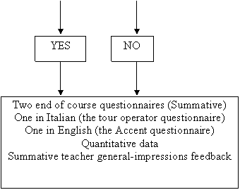 The Accent end-of-course questionnaire did not elicit data regarding school objectives 2 and 3 i.e. students were only asked whether they thought they had improved or not. This was felt to be a subjective question, after all, feeling you have improved does not necessarily mean you have improved (vice versa). The Accent questionnaire used happy and sad faces (LJ) instead of a ranked scale i.e. this may have been easier to interpret. The Accent questionnaire vocabulary however was quite advanced and some of it had to be pre-taught. A possible weakness in the Accent questionnaire was it was not anonymous i.e. would student feedback (especially feedback regarding the teaching programme) really be reliable? The Italian group-leader questionnaire was in Italian, it was partly anonymous (i.e. students had to write in a contact address but no name) and it used a ranked scale (NB it is possible that the ranked scale may have been misunderstood by some of the students).