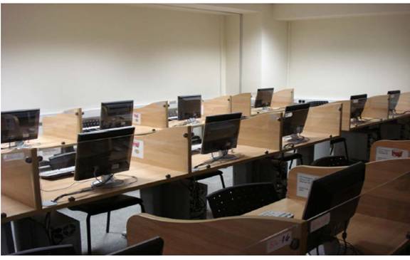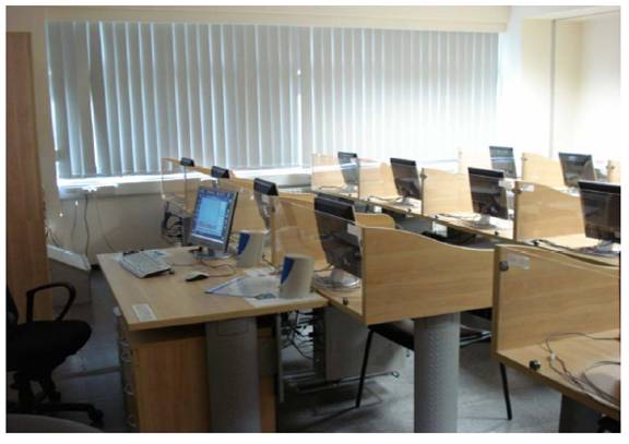 Modern language lab furniture layout usually fulfils two functions. The first furniture layout, with student computers usually not all facing in the direction of the teacher or teacher’s computer, suggests the lab will be used for self-access or in a way that might facilitate collaborative study (Dunkel 1991, Beatty 2003). The second furniture design, with all the computers facing the teacher suggests that traditional face-to-face teaching can take place and so the teacher might be able to take on a more prominent teacher role.