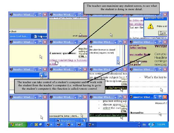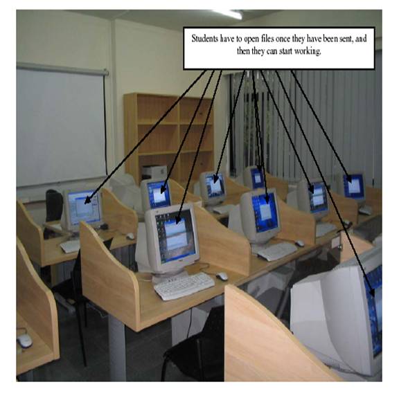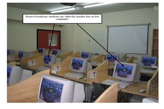 An option that uses the monitor function in a way that might assist the teacher who has chosen to monitor and assist students individually by ‘physically’ going round the classroom is projecting the contents of the teacher’s computer onto the projector screen. Students are then aware that what they are doing can be seen by the teacher, and the teacher can see (i.e. on the projector screen) what the students are doing while she is going round the lab. Plate 8 illustrates how this would appear to a teacher or students working in a language lab.
