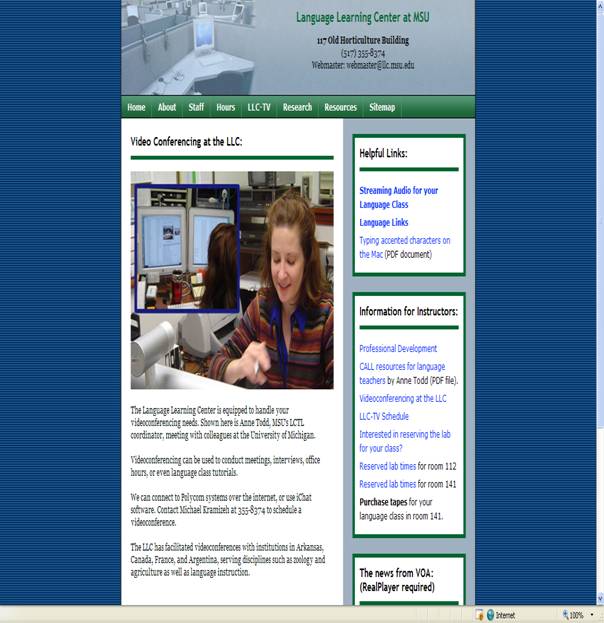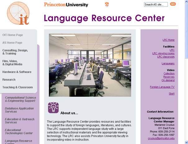 Figure 1 presents an example of a language-lab homepage offering extensive services. The Language Resource Center at Princeton University states that it provides “resources and facilities to support the study of foreign languages, literatures, and cultures”; moreover it also states that it supports independent language study and assists Princeton University faculty in incorporating video into instruction.