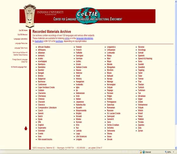 Indiana University, in Figure 2, provides archives of over 130 languages available for listening online or for use in language laboratories.