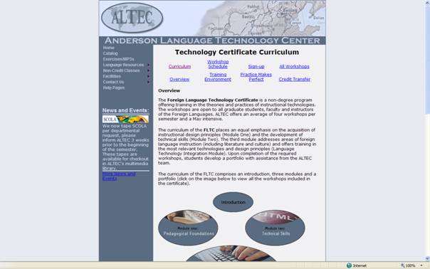 The Foreign Language Technology Certificate presented in Figure 5 at the University of Colorado-Boulder offers training in the theories and practices of instructional technologies. The workshops are open to all graduate students, faculty and instructors of the Foreign Languages.