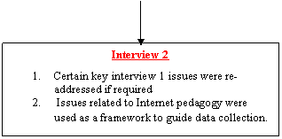 The research framework was based on pertinent literature and professional context. The areas that were analysed were: confidence, competence, time, components comprising Internet site quality, and some other potentially relevant domains of research. Other issues analysed were Internet lesson planning, student epistemology[4], syllabus design, improvement, roles and change.