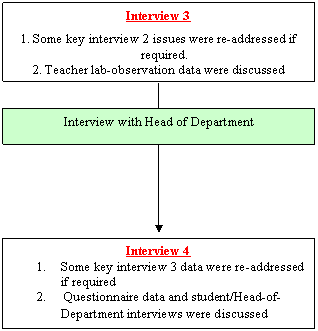 The interpretative paradigm used in this study provided a thick and personalised description of research issues and a platform from which interpretations were made. Figure 1 below provides a visual summary of how data were collected. It describes how the four semi-structured interviews of about 30-40 minutes in length were undertaken on the six teachers over a five-to-seven month period in the research.