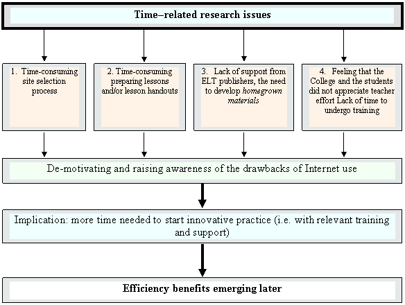 Figure 4 below attempts to link the issues discussed in this section to outcome. Its implication for the concept of time as a management of change phenomenon is, more time may be needed to start innovative practice with efficiency benefits emerging later (i.e. time is needed for new ideas to percolate through to teachers en masse). This implication echoes with Downes et al., (2001: 75) who assert that teachers, researchers, and policymakers consistently indicate that the greatest challenge to implementing effective professional development is having time to understand new concepts, learn new skills, develop new attitudes, research, reflect, discuss, access, try new approaches and integrate them into their practice, time to plan their own professional development. Moreover Manternach-Wigans et al. (1999 cited in Jones 2004: 15) also hold that teachers need more time to learn computer basics, plan how to integrate technology into their lessons, and actually use the technology in the classroom.