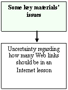 · Select suitable sites level-wise (i.e. grammar/vocabulary) and topic-wise. However data suggested that this was a difficult undertaking. Teachers first had to search ESOL homepages (i.e. from a vast and growing collection of homepages) and then choose exercises usually from a substantial assemblage of exercises per ESOL homepage. Moreover a pertinent characterisation of the data was that ‘searching’ for a list of possible lesson sites was more time-consuming than ‘choosing’ which sites from that list would be used. Finding suitable course-relevant Internet lesson sites was therefore a difficult task. Godwin-Jones (1999: 12-16) holds the opinion that a troublesome issue with Internet-use is locating desirable Websites that are appropriate in terms of language level, media format, interest and reliable information. Furthermore, it was very time consuming to prepare lesson handouts in Word or PowerPoint format.